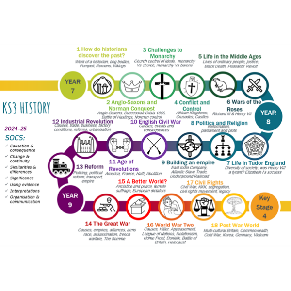 The Y7 History curriculum is designed to build on students’ historical learning at KS2 and to develop their subject specific historical skills. We begin with a focus on the work of some key historians on the ancient history of pre-1066 that they have covered in their primary years. We then take them chronologically through the medieval period with a series of enquiry questions which focus on the key skills of History and introduce them to the key historical concepts of parliament, monarchy, diversity, revolution, empire and justice. We aim to build their confidence in thinking and writing like a historian.